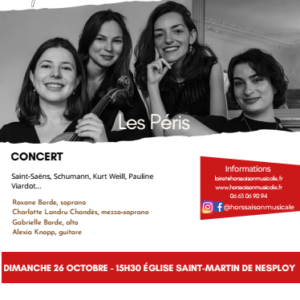 C’est la rentrée pour les concerts HIORS SAISON MUSICALE Le 26 octobre à 15h30 à l’église de Nesploy, le quatuor LES PERIS Le 25 octobre à 11h à la Bibliothèque de Nibelle…